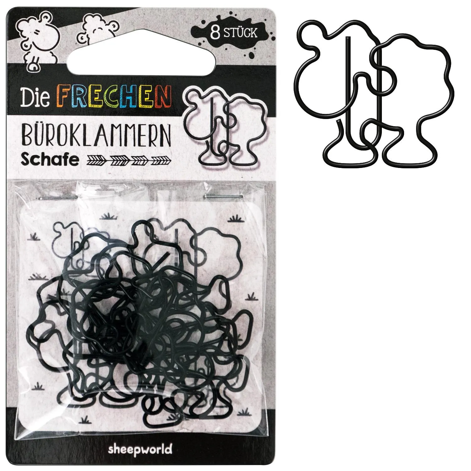 Määähga! Peppe mit den schwarzen Büroklammern in Schaf-Form langweilige Dokumente auf. So verwandelt sich der öde Büroalltag ganz schnell zu einem tierischen Abenteuer. Ein Tütchen enthält acht Klammern in Form eines sheepworld-Schafs.